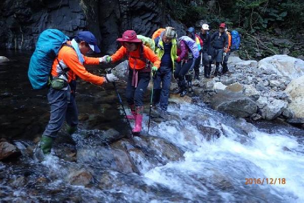 沿著往嘎拉賀溫泉的步道下行,會先經過一座涼亭,再經過第二座涼亭,往稜山的登山口就在涼亭的後方,有路條很好辨認。從登山口進入是一片竹林,順著明顯山徑行走,有些倒竹要小心通過。過了竹林接著進入雜木林內,不久又再度進入竹林,順著山腰繞行,有些路段山徑稍小,宜小心通過。快下到三光溪時要拉繩下降一塊突岩,隨即抵三光溪H818M。過溪後一陡上,路況不是很好要小心拉繩緩緩而上,上稜後路況好轉許多。感覺這稜山新路線,比唐穗山原始很多,林相也不錯,,只是路徑有比較不明顯,時時要找路,有點難纏。過了三兄弟神木後,要攻頂時間己超過,,在大約海拔1615M較平坦地方,夥伴們肚子也餓。趕緊埋鍋造飯,吃飽喝足才有體力,只好再循原路折返回停車處,我們還會回來再挑戰有點難纏的稜山新路線~