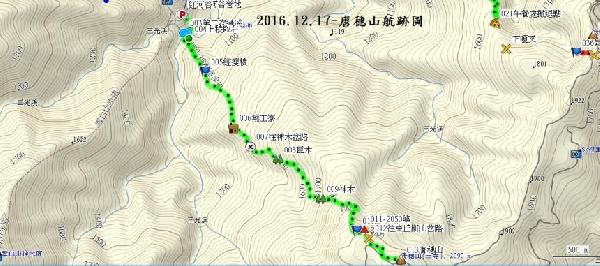 D1.06:03營地出發→06:34第一次過溪→06:48第二次過溪→07:02上稜線取右→07:42經瘦稜→08:31廢工寮(小休10分鐘)→08:56往神木岔路→09:17經巨木→09:59神木→11:24拉繩陡上→11:42抵2050峰→11:54往東丘斯山岔路取直行→12:38登頂唐穗山(午餐)→13:30原路返回→18:25回抵營地(宿)